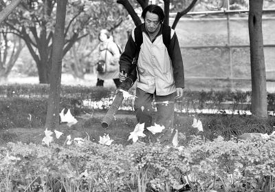 昨天,中山公园的保洁工人正在用吹风机清理花坛内的落叶。为让市民欣赏深秋落叶美景,该园对飘落在花坛内的树叶一般不作清理。但时间长了落叶会腐烂,影响青草生长,增加清理难度,吹风机极好地解决了这个难题。